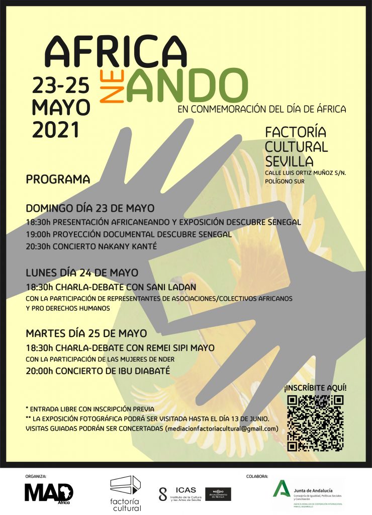 Este año, la celebración tradicional de MAD África «Africaneando» estará dedicada a homenajear el día de África (conmemorado el día 25 de mayo). Serán tres días donde nos acercaremos a África, a la fortaleza de su pueblo, a la expresión de su cultura y a la realidad enfrentada por la diáspora. Lo haremos a través un ciclo de charlas-debates con Sani Ladan y Remei Sipi Mayo, conciertos de Nakany Kanté e Ibu Diabaté y de la Exposición fotográfica y audiovisual “Descubre Senegal”, de autoría de Paulo Ramalho y Blanca Reina.