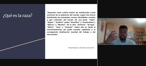 Yeison comienza situándose; afrocolombiano y afroespañol, por la necesidad de territorializar la lucha en el contexto en el que vive. Su propio nombre, Yeison, clara seña colonial que le dejaron sus padres que le ha marcado y lo ha llevado siempre a la reflexión. Las asociaciones a las que pertenece y el lugar en el que se sitúa dentro de la lucha antirracista terminan su presentación. Unas definiciones que utiliza para concretar la necesidad de ver desde dónde hablamos, nuestro lugar de enunciación aunque como él mismo dice, en ocasiones exista un debate abierto sobre cómo debemos definirnos.