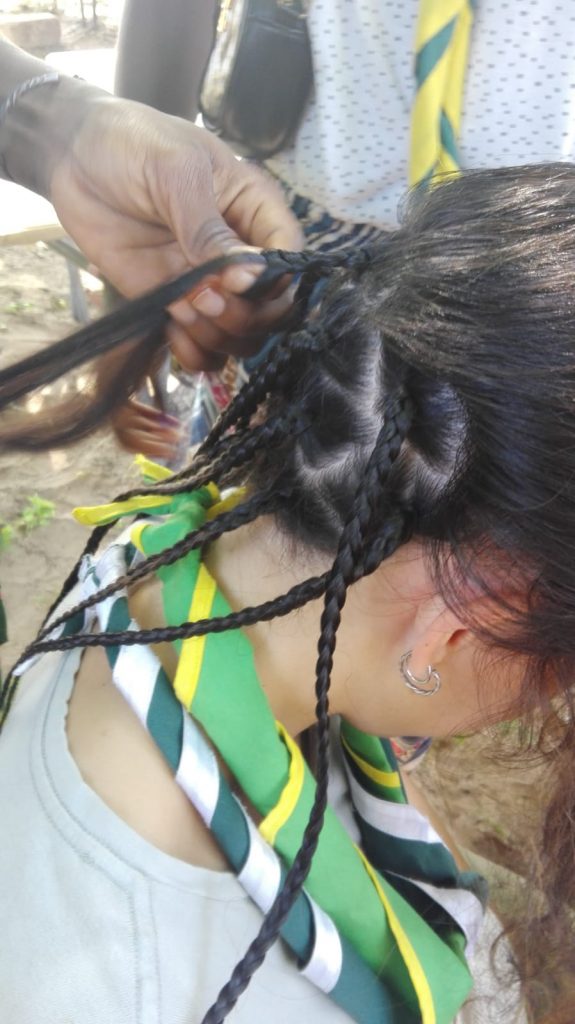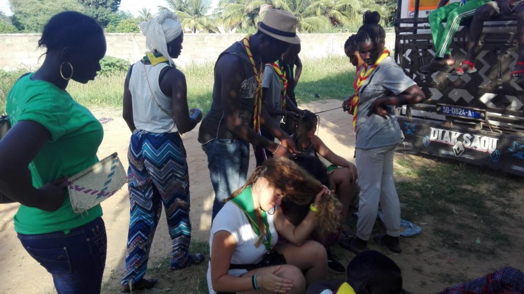Tras la comida (pescado con arroz), recogimos todo, lo montamos en el bus (ha sido como cargar la furgo del campamento) y nos hemos ido a Joal Fadiouth. Mientras esperábamos a irnos a muchas de nosotros nos han llenado el pelo de trencitas ¡Lo estábamos deseando! Gracias al ritmo senegalés, el viaje ha sido mágico.