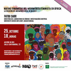 El próximo día 25 de octubre, a las 18 horas en Acción en Red, Fatou Sarr impartirá, dentro del marco de los proyectos Red Ataya y Kaay Universidad, una charla sobre las Nuevas dinámicas del movimiento feminista en África: la evolución del movimiento social de mujeres en África.