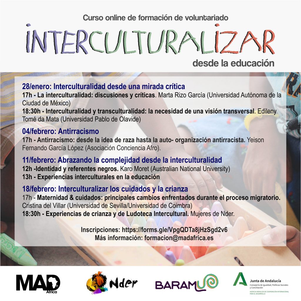 Interculturalizar desde la educación es un curso de formación de voluntariado promovido por MAD África. El objetivo es contribuir a la construcción de una ciudadanía transformadora a través de una mirada crítica hacia la interculturalidad, haciendo hincapié en las discriminaciones y pérdidas de referentes afrontadas, sobre todo, por la infancia y juventud afrodescendiente. Acercándose a experiencias vitales de crianza y cuidados vividas por familias migrantes, buscaremos encontrar algunas claves para trabajar la interculturalidad desde ámbitos educativos formales y no formales.