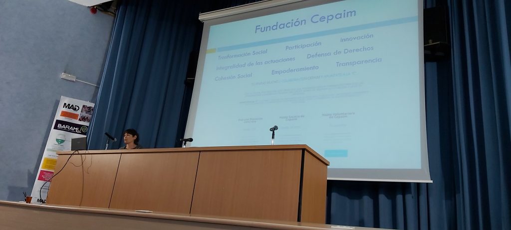 Finalmente, participó Begoña Gallardo, perteneciente a la Fundación Cepaim. Cepaim es una organización independiente, cohesionada y sostenible que responde a dinámicas sociales relacionadas con el hecho migratorio y con los procesos de exclusión social. La misión de esta organización es fomentar un modelo de sociedad inclusiva e intercultural que posibilite el acceso pleno a los derechos de ciudadanía de las personas más vulnerables de nuestra sociedad y, de forma especial, de las personas migrantes, desarrollando políticas de lucha contra cualquier forma de exclusión social y cooperando en el desarrollo de los territorios locales y de los países de origen de los/as migrantes. Los valores que destacan de esta organización son la interculturalidad, la justicia social, el compromiso, la solidaridad, la igualdad de trato y la no discriminación, la igualdad de oportunidades entre hombres y mujeres y la gestión de la diversidad. Begoña explicó en qué consistía el programa NOS-OTRAS, que tiene como objetivo favorecer la participación de las mujeres inmigrantes, su liderazgo, empoderamiento, capacitación y visibilidad en cinco territorios: Sevilla, Murcia, Valencia, Barcelona y Madrid.